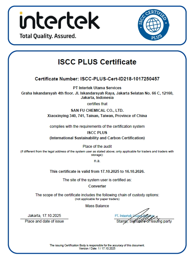 三福化工股份有限公司善化廠,在專業輔導下,於 2025 年 10 月順利完成並取得 ISCC PLUS 國際可持續發展和碳認證。